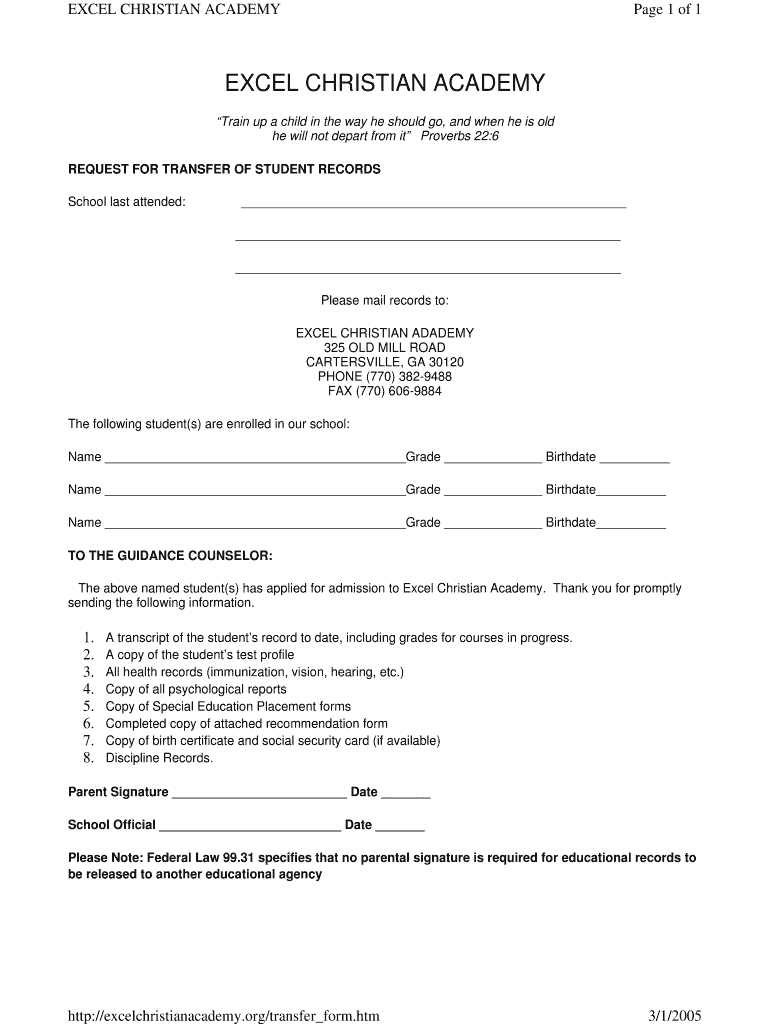 EXCEL CHRISTIAN ACADEMY Page 1 of 1 EXCEL CHRISTIAN ACADEMY Train up a child in the way he should go, and when he is old he will not depart from it Proverbs 22:6 REQUEST FOR TRANSFER OF STUDENT RECORDS