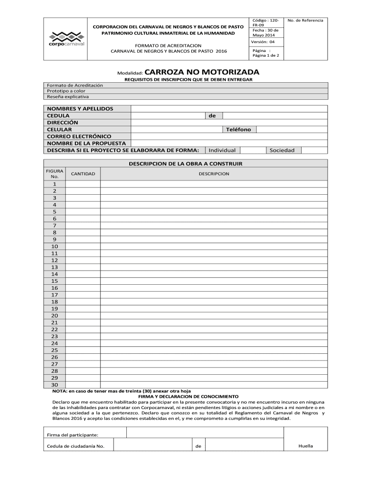 C Diego : 120FR-09 Tech : 30 de Mayo 2014 CORPORACIÓN DEL CARNIVAL DE NEGROS Y BLANCO DE PAST PATRIMONY CULTURAL IMMATERIAL DE LA HUMANIZED FORMAT ODE ACCREDITATION CARNIVAL DE NEGROS Y BLANCO DE