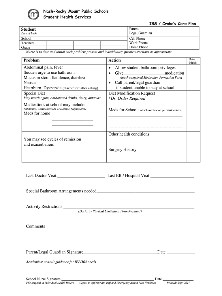 The IBS Crohn’s Care Plan is a medical consent form used by Nash-Rocky Mount Public Schools to manage the health needs of students with IBS or Crohn’s disease.