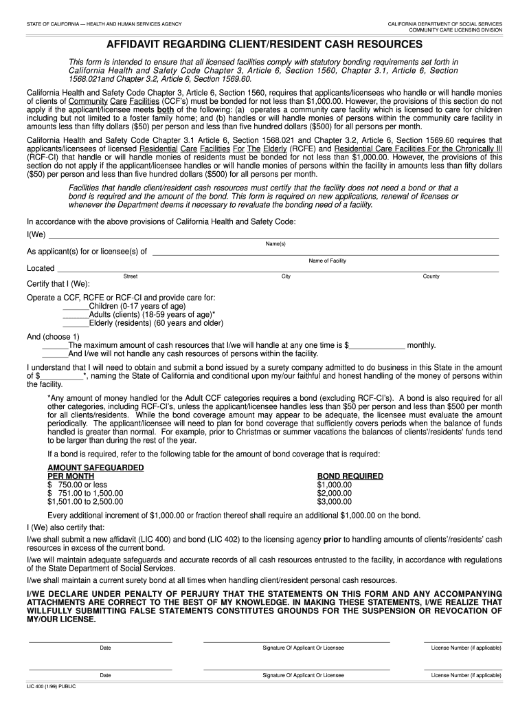 The California Client Resident Cash Resources Affidavit, also known as LIC 400, is a vital legal document utilized by licensed facilities in California. This affidavit is essential for ensuring compliance with bonding requirements associated with the handling of client or resident cash resources. Its significance lies in its role in protecting both the facility and the residents by verifying that proper financial protocols are in place.