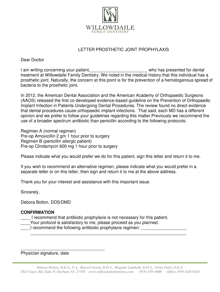 LETTER PROSTHETIC JOINT PROPHYLAXIS Dear Doctor I am writing concerning your patient, who has presented for dental treatment at Willowware Family Dentistry. We noted in the medical history that this