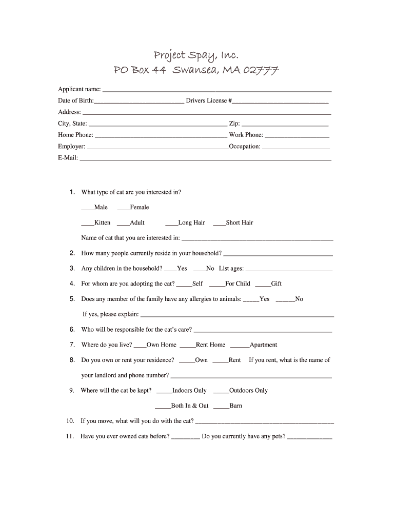 Project Spay, Inc. PO Box 44 Swansea, MA 02777 Applicant name: Date of Birth: Driver's License # Address: City, State: Zip: Home Phone: Work Phone: Employer: Occupation: Email: 1. What type of cat