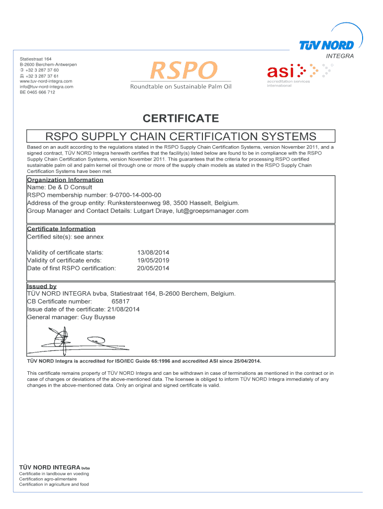 Get the free CERTIFICATE RSPO SUPPLY CHAIN CERTIFICATION SYSTEMS