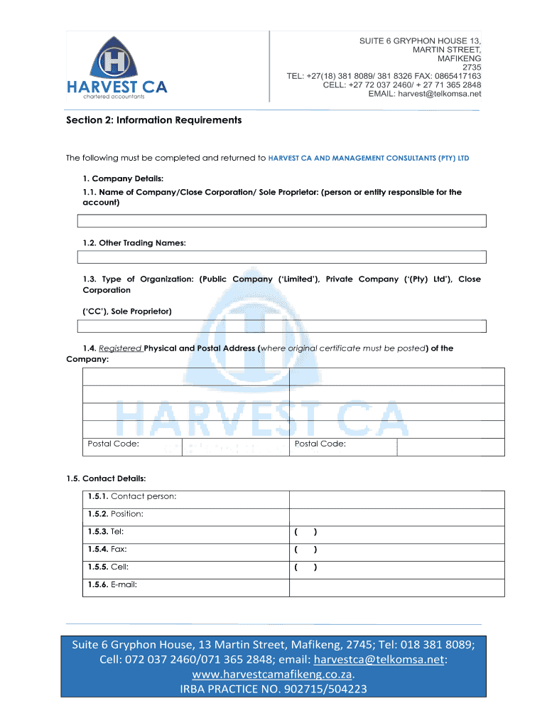 Section 2: Information Requirements The following must be completed and returned to HARVEST CA AND MANAGEMENT CONSULTANTS (PTY) LTD 1. Company Details: 1.1. Name of Company/Close Corporation/ Sole