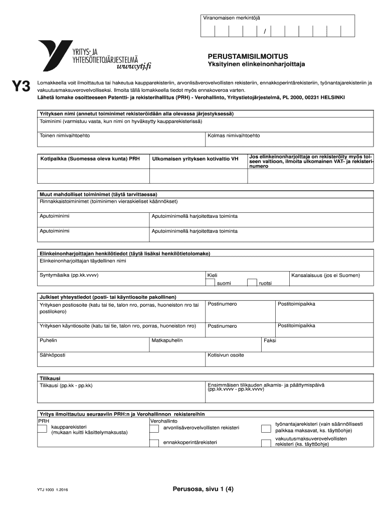 Get the free 1003 Y3 PERUSTAMISILMOITUS Yksityinen elinkeinonharjoittaja Y3 PERUSTAMISILMOITUS Yk...