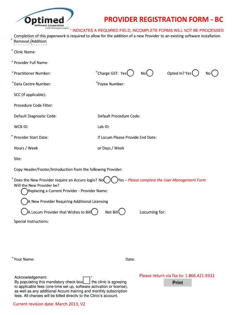 PROVIDER REGISTRATION FORM — BC Completion of this paperwork is required to allow for the addition of a new Provider to an existing software installation.