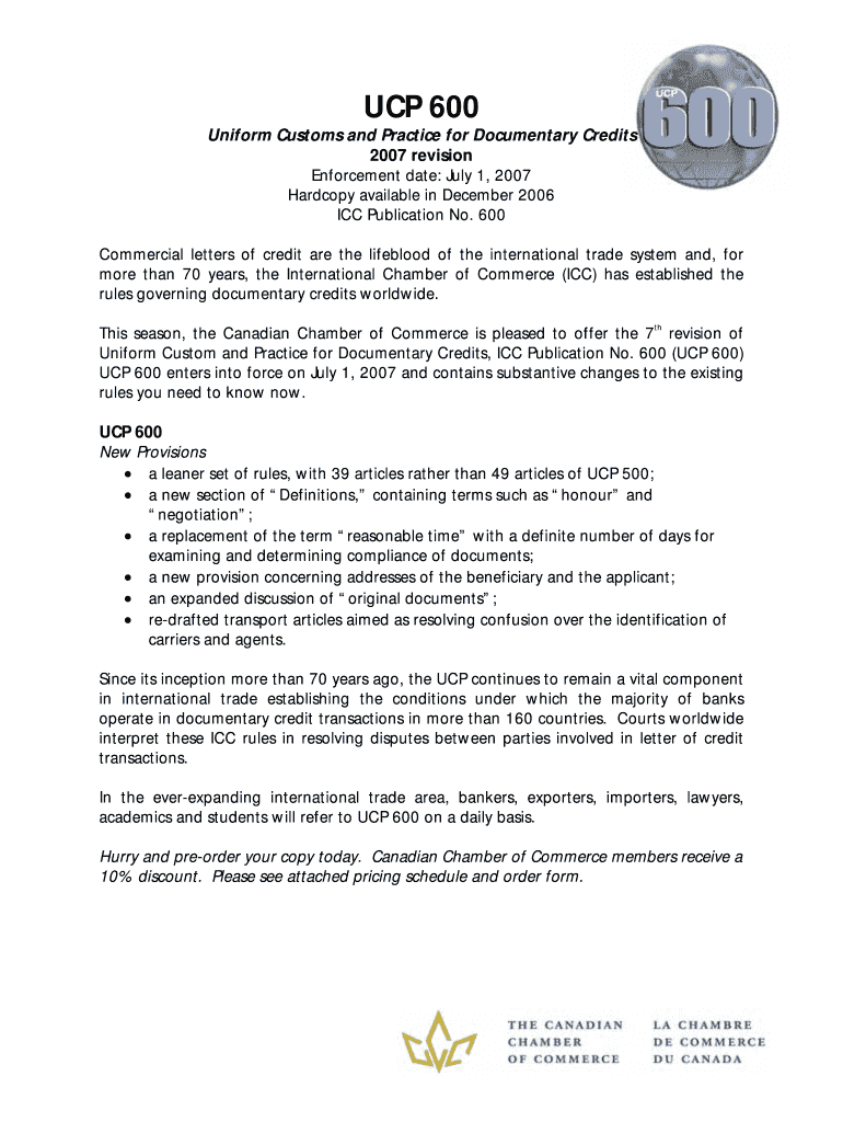 The UCP 600 Order Form is an essential tool for pre-ordering the Uniform Customs and Practice for Documentary Credits publication from the Canadian Chamber of Commerce. This form plays a pivotal role in international trade by ensuring compliance with UCP 600 rules.