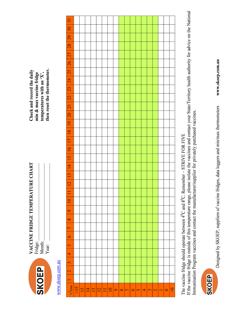 1 2 3 4 5 6 7 8 9 10 11 12 13 14 15 16 17 18 19 20 21 22 23 24 25 26 27 28 29 30 31 Check and record the daily min & max vaccine fridge temperatures with an X, then reset the thermometer. Designed