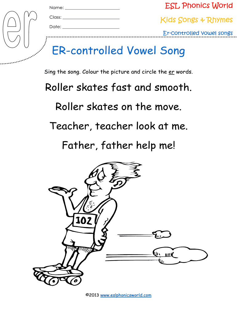 Name: Class: Date: ESL Phonics World Kids Songs & Rhymes Er controlled vowel songs ER controlled Vowel Song Sing the song. Color the picture and circle the words. Roller skates fast and smooth. Roller