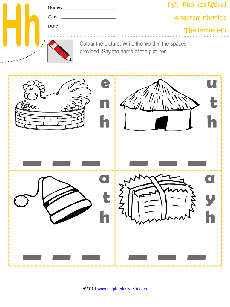 Get the free Name: Class: Date: ESL Phonics World Anagram phonics The letter Hh Colour the picture