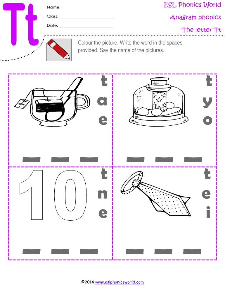 Get the free Name: Class: Date: ESL Phonics World Anagram phonics The letter Tt Colour the picture
