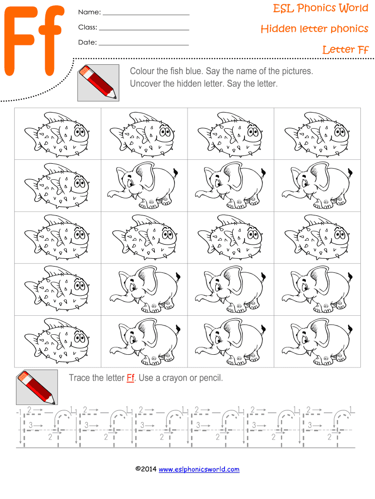 Get the free Name: Class: ESL Phonics World Hidden letter phonics Date: Letter Ff Colour the fish...