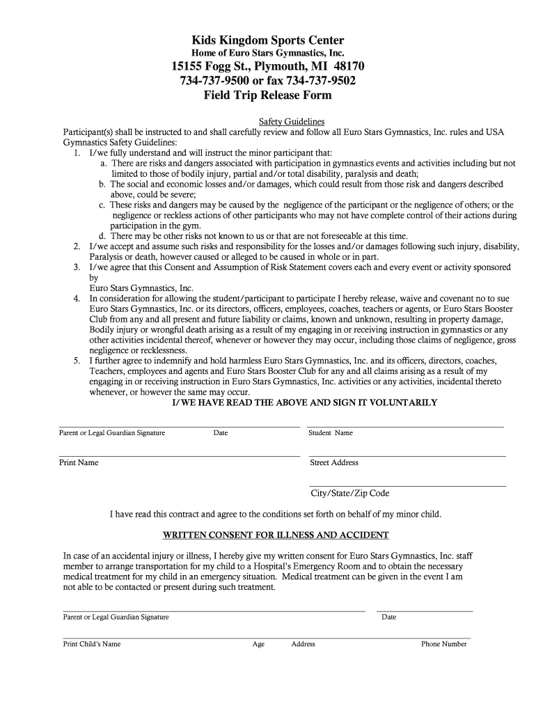 Kids Kingdom Sports Center Home of Euro Stars Gymnastics, Inc. 15155 Fog St., Plymouth, MI 48170 7347379500 or fax 7347379502 Field Trip Release Form Safety Guidelines Participant(s) shall be instructed