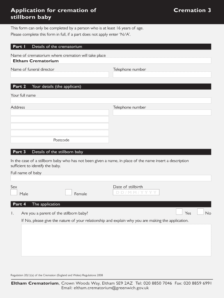 Get the free BApplicationb for cremation of Cremation 3 stillborn baby - Greenwich - royalgreenwi...