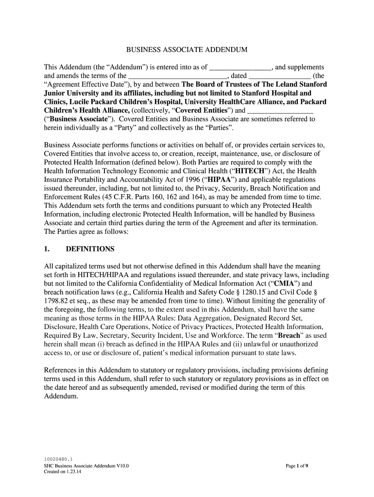 Get the free BUSINESS ASSOCIATE ADDENDUM This Addendum - Stanford ... - privacy stanford