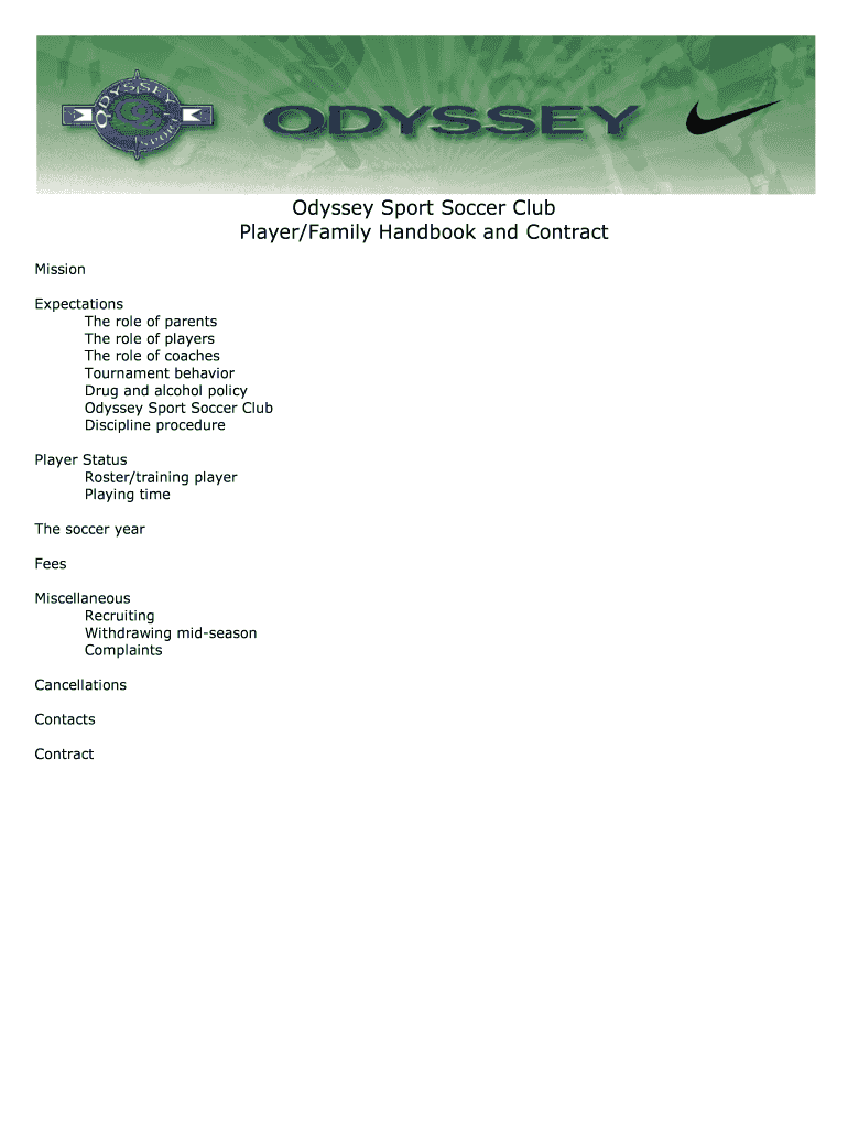 Odyssey Sport Soccer Club Player/Family Handbook and Contract Mission Expectations The role of parents The role of players The role of coaches Tournament behavior Drug and alcohol policy Odyssey Sport
