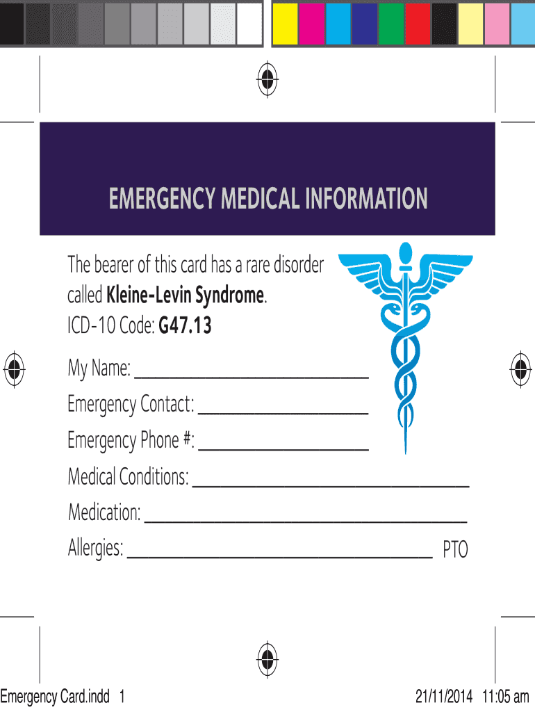 EMERGENCY MEDICAL INFORMATION The bearer of this card has a rare disorder called KleineLevin Syndrome. ICD10 Code: G47.13 My Name: Emergency Contact: Emergency Phone #: Medical Conditions: Medication:
