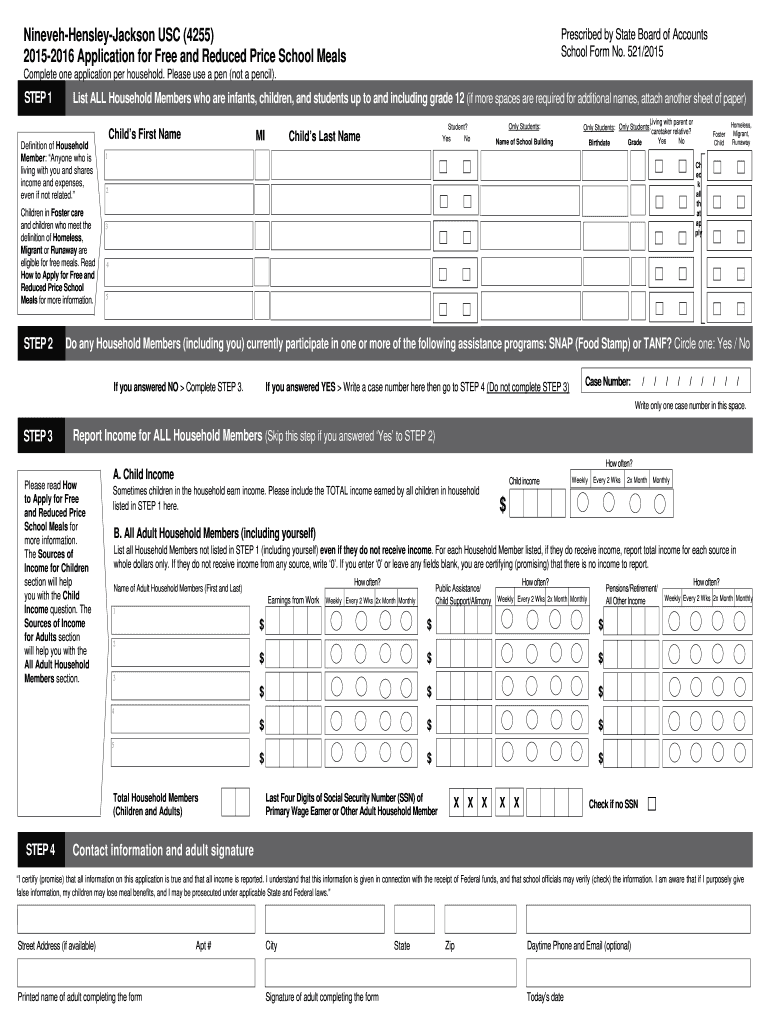 NinevehHensleyJackson USC (4255) 20152016 Application for Free and Reduced Price School Meals Prescribed by State Board of Accounts School Form No. 521/2015 Complete one application per household.