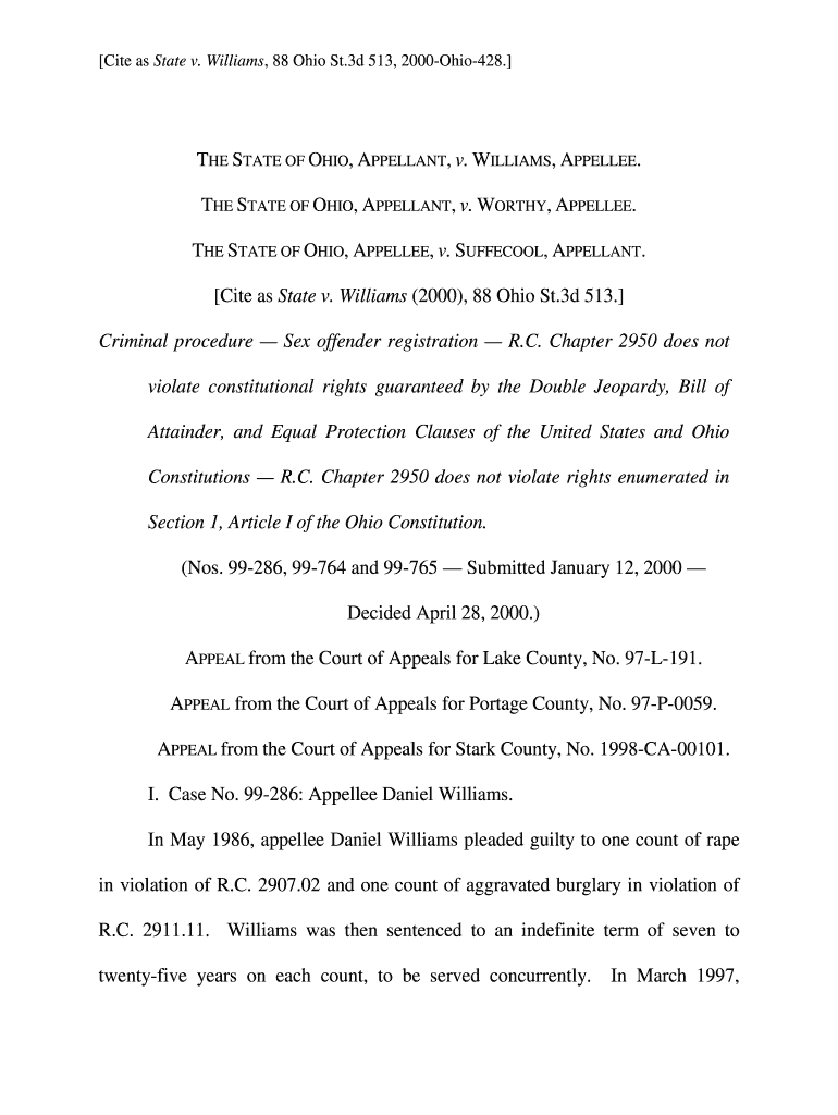 Cite as State v. Williams, 88 Ohio St.3d 513, 2000Ohio428. THE STATE OF OHIO, APPELLANT, v. WILLIAMS, APPEALED. THE STATE OF OHIO, APPELLANT, v. WORTHY, APPEALED. THE STATE OF OHIO, APPEALED, v. SUBCOOL,