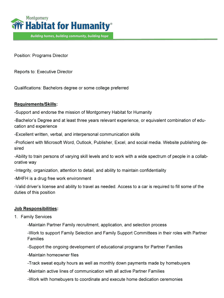 Building homes, building community, building hope Position: Programs Director Reports to: Executive Director Qualifications: Bachelors degree or some college preferred Requirements/Skills: Support