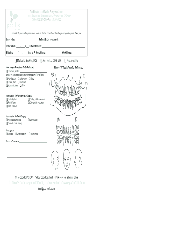 Visit the Pacific Oral and Facial website or go to their clinic to get the necessary forms.
