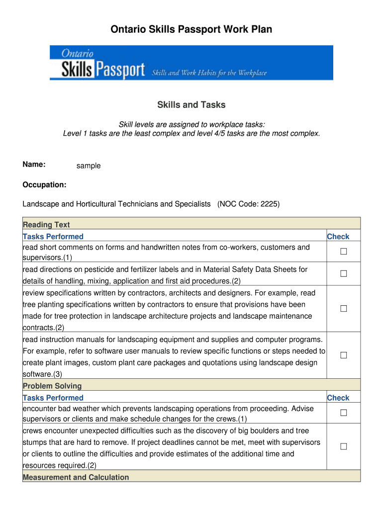 Ontario Skills Passport Work Plan Skills and Tasks Skill levels are assigned to workplace tasks: Level 1 tasks are the least complex and level 4/5 tasks are the most complex. Name: sample Occupation:
