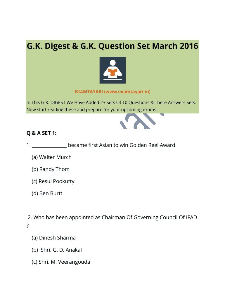 G.K. Digest & G.K. Question Set March 2016 EXAMTAYARI (www.examtayari.in) In This G.K. DIGEST We Have Added 23 Sets Of 10 Questions & There Answers Sets. Now start reading these and prepare for your