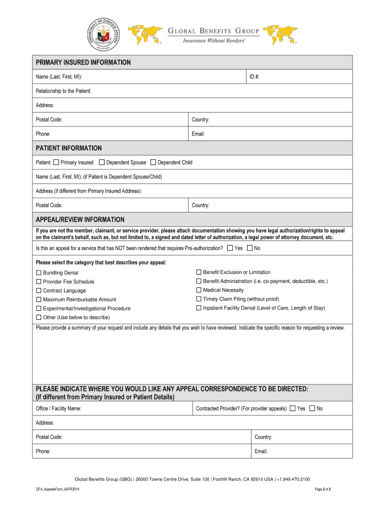 Global Benefits Group (GBG) 26000 Town Center Drive, Suite 100 Foothill Ranch, CA 92610 USA +1.949.470.2100 DFA AppealsForm 8APR2014 Page 2 of 2