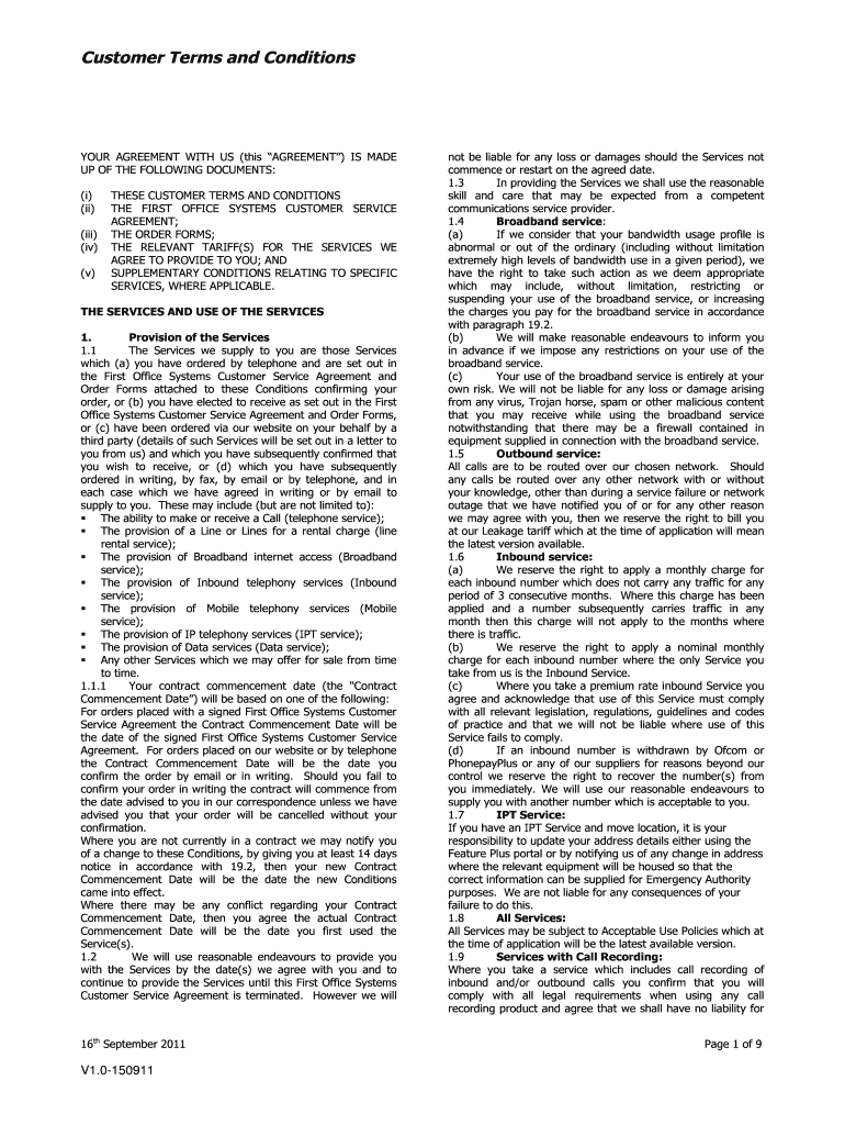 Customer Terms and Conditions YOUR AGREEMENT WITH US (this AGREEMENT) IS MADE UP OF THE FOLLOWING DOCUMENTS: (i) (ii) (iii) (iv) (v) THESE CUSTOMER TERMS AND CONDITIONS THE FIRST OFFICE SYSTEMS CUSTOMER