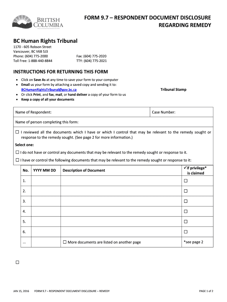 Get the free Form 97 ONLINE Respondent Document Disclosure Regarding Remedy Form 97 ONLINE Respon...
