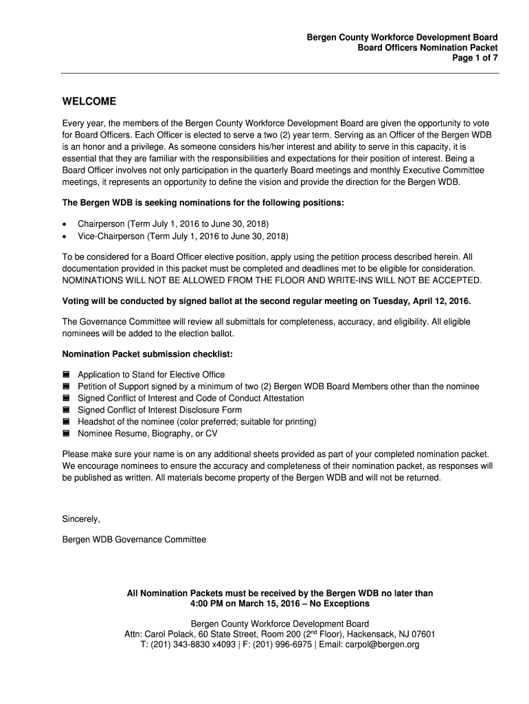 Bergen County Workforce Development Board Officers Nomination Packet Page 1 of 7 WELCOME Every year, the members of the Bergen County Workforce Development ...