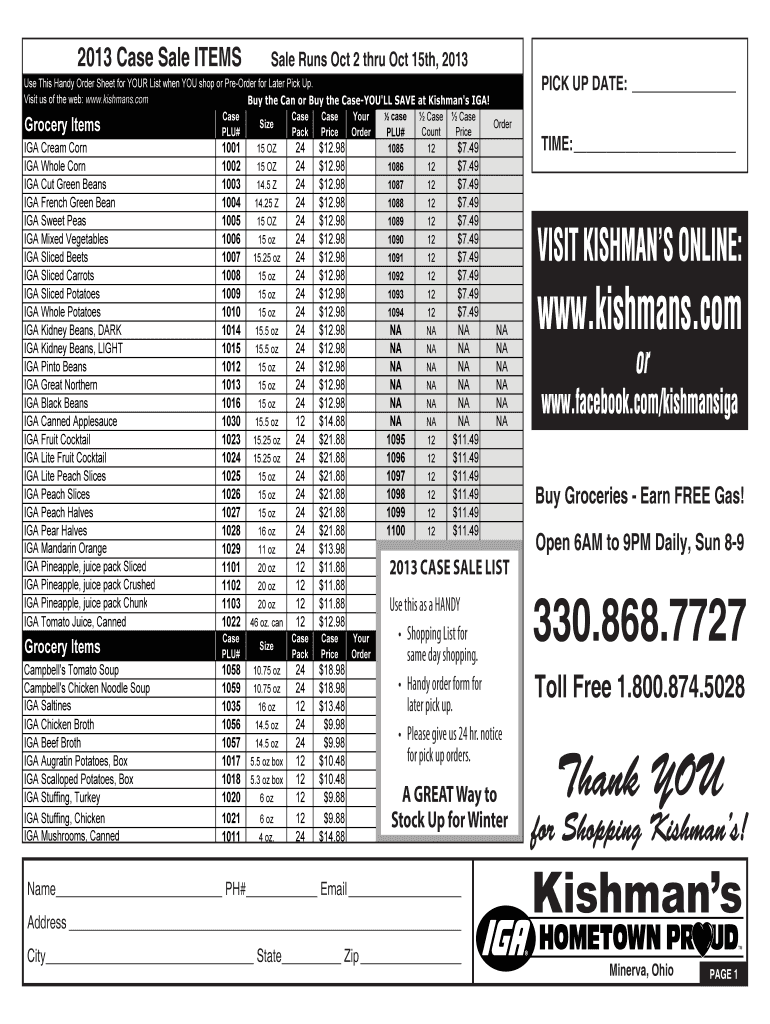 2013 Case Sale ITEMS Sale Runs Oct 2 through Oct 15th, 2013 Use This Handy Order Sheet for YOUR List when YOU shop or PreOrder for Later Pickup. Visit us of the web: www.kishmans.com Buy the Can or