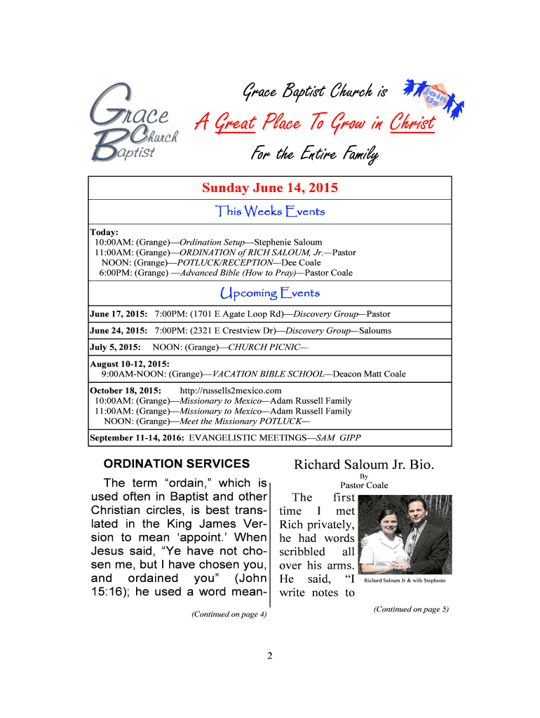 Grace Baptist Church is A Great Place To Grow in Christ For the Entire Family Sunday, June 14, 2015, This Week's Events Today: 10:00AM: (Grange)Ordination SetupStephenie Album 11:00AM: (Grange)ORDINATION