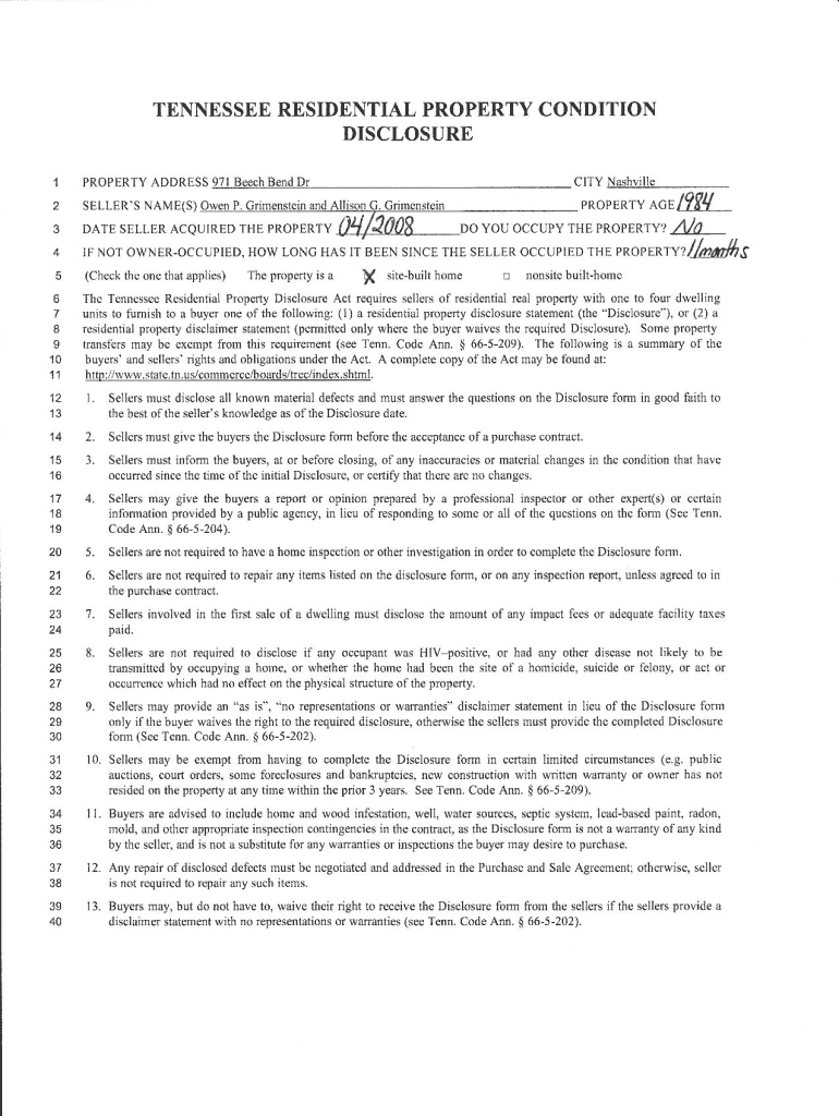 Get the free Tennessee Residential Property Disclosure Form