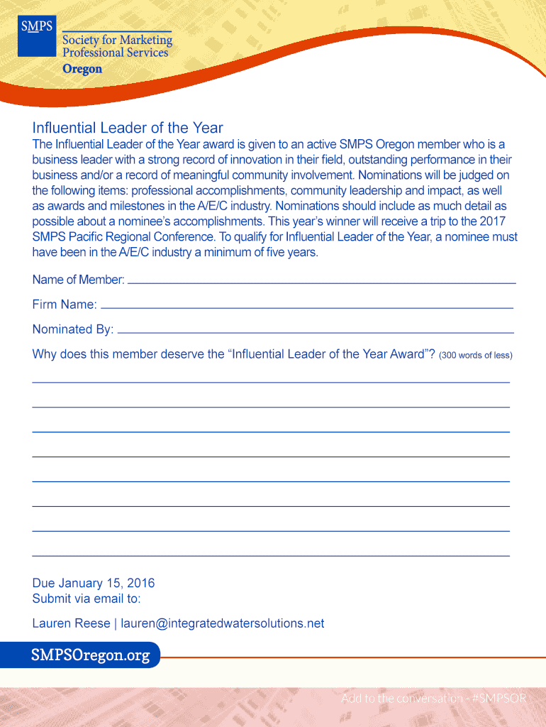 Influential Leader of the Year The Influential Leader of the Year award is given to an active SMS Oregon member who is a business leader with a strong record of innovation in their field, outstanding