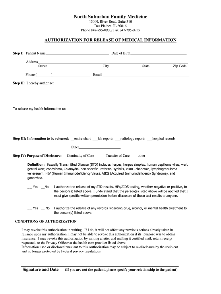 North Suburban Family Medicine 150 N. River Road, Suite 310 Des Plaines, IL 60016 Phone 8477950900/ Fax 8477950955 AUTHORIZATION FOR RELEASE OF MEDICAL INFORMATION Step I: Patient Name Date of Birth