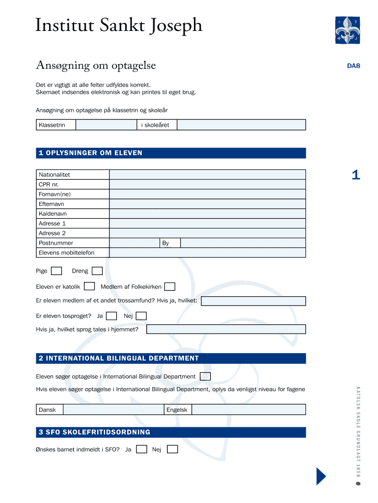 Get the free DA8 Institut Sankt Joseph Ans gning om optagelse Det er vigtigt at alle felter udfyl...