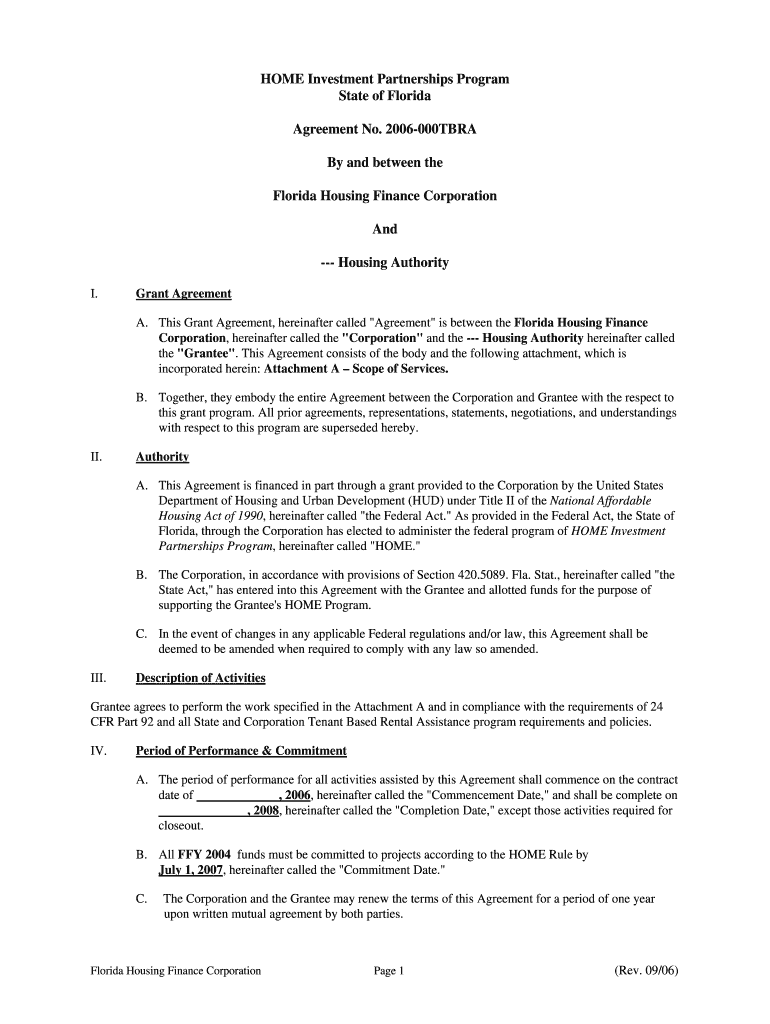HOME Investment Partnerships Program State of Florida Agreement No. 2006-000TBRA By and between the Florida Housing Finance Corporation And --- Housing Authority I. Grant Agreement A. This Grant Agreement,