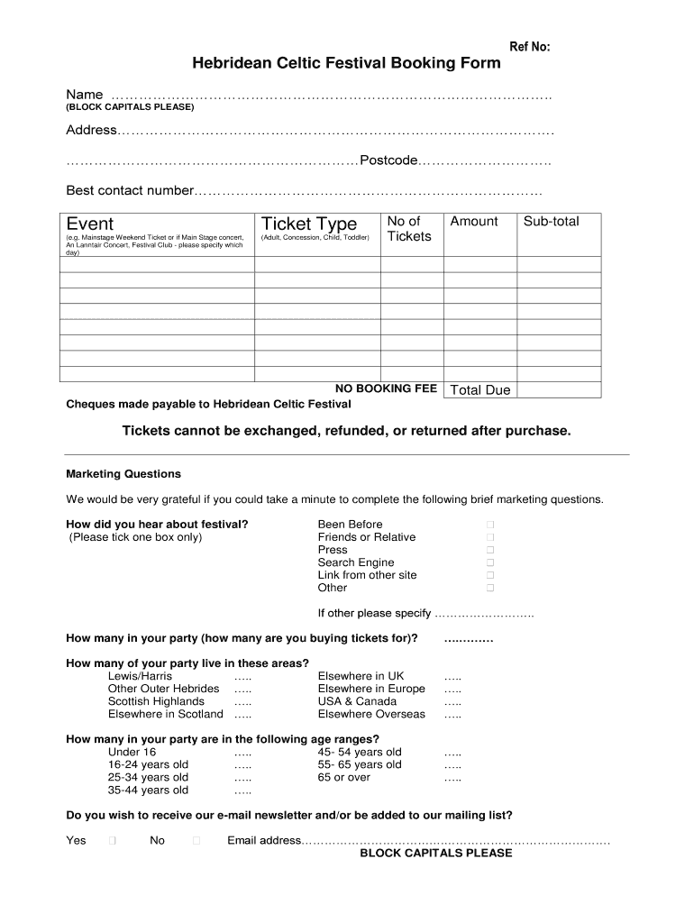 Ref No: Hebrides Celtic Festival Booking Form Name. (BLOCK CAPITALS PLEASE) Address. Postcode. Best contact number Event Ticket Type (e.g. Main stage.