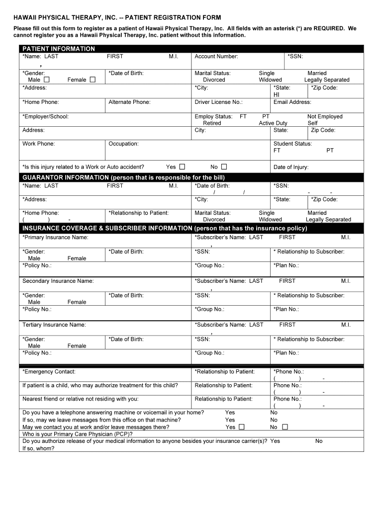 HAWAII PHYSICAL THERAPY, INC. PATIENT REGISTRATION FORM Please fill out this form to register as a patient of Hawaii Physical Therapy, Inc. All fields with an asterisk (*) are REQUIRED. We cannot