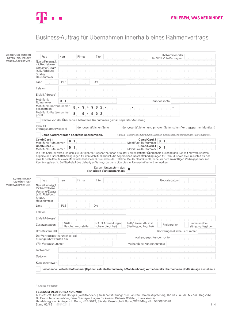 Business-Auftrag f r henchmen internal lines Rahmenvertrags Renumber Oder f r VPN: VPN-Vertragsnr. 1 4 MOBILFUNK-KUNDEN-DATEN (FISHERIES VERTRAGSPARTNER)