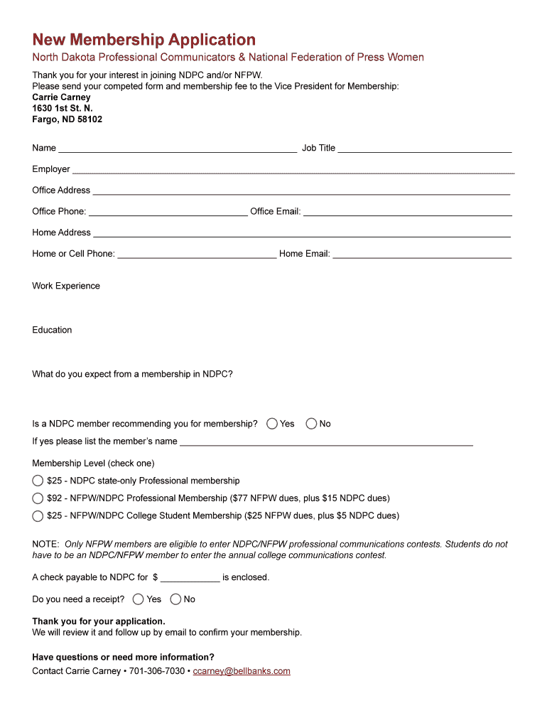 New Membership Application North Dakota Professional Communicators & National Federation of Press Women Thank you for your interest in joining NPC and/or NF PW.