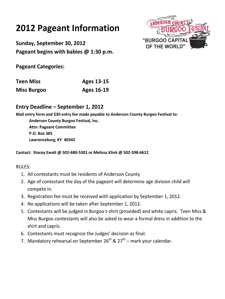 2012 Pageant Information Sunday, September 30, 2012, Pageant begins with babies 1:30 p.m. Pageant Categories: Teen Miss Bur good Ages 1315 Ages 1619 Entry Deadline September 1, 2012, Mail entry form