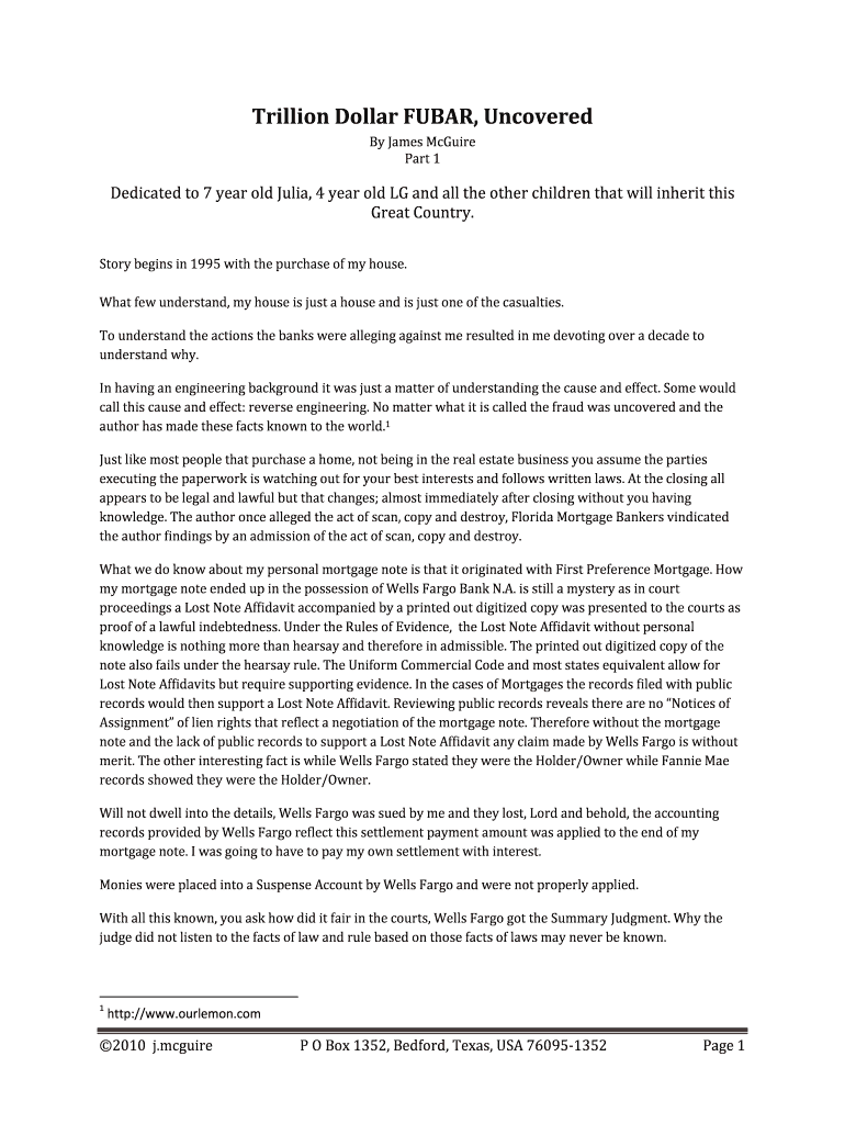 TrillionDollarFUBAR, Uncovered ByJamesMcGuire Part1 Dedicatedto7yearoldJulia,4yearoldLGandalltheotherchildrenthatwillinheritthis GreatCountry. Storybeginsin1995withthepurchaseofmyhouse. Whatfewunderstand,