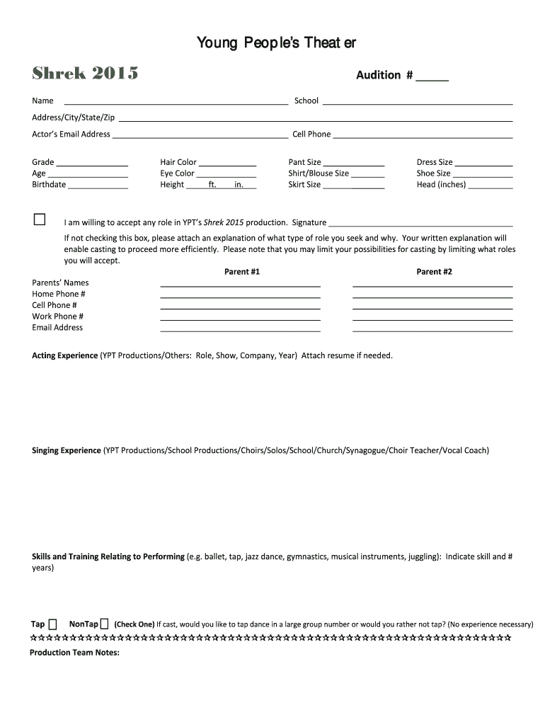 Young People s Theater Shrek 2015 Audition # Name. School Address/City/State/Zip. Actor s Email Address. Cell Phone Grade. Hair Color Pant Size Dress Size.