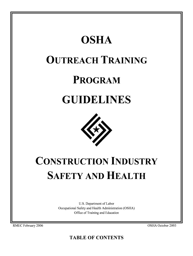 OSHA OUTREACH TRAINING PROGRAM GUIDELINES CONSTRUCTION INDUSTRY SAFETY AND HEALTH U.S. Department of Labor Occupational Safety and Health Administration (OSHA) Office of Training and Education RMC