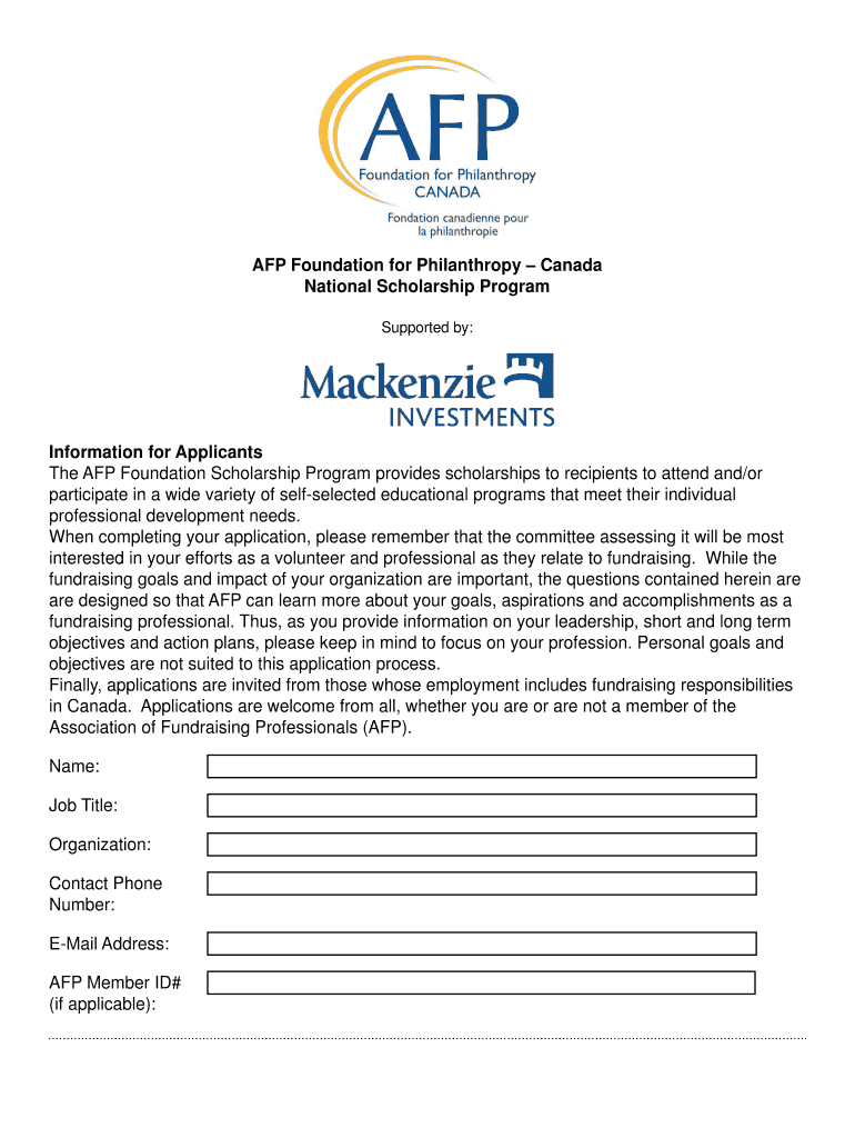 AFP Foundation for Philanthropy Canada National Scholarship Program Supported by: Information for Applicants The AFP Foundation Scholarship Program provides scholarships to recipients to attend and/or