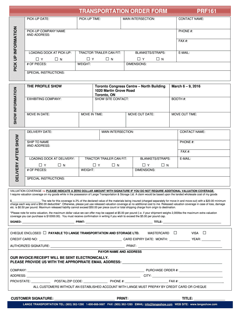 Get the free TRANSPORTATION ORDER FORM PRF161 - The Profile Show - profileshow