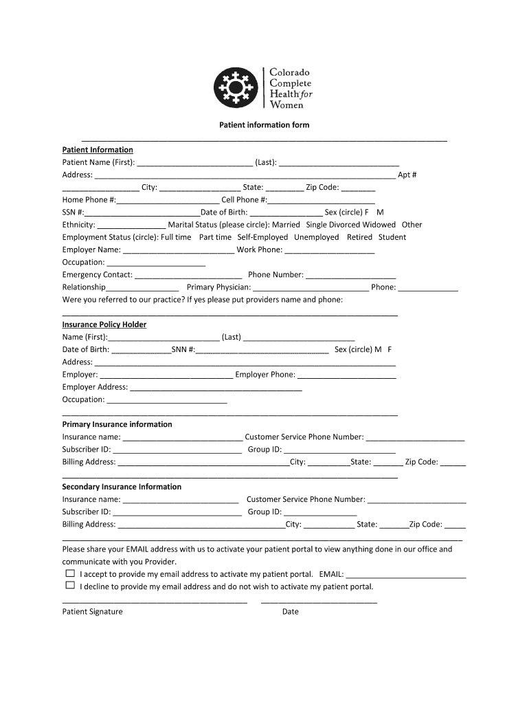 Patient information form Patient Information Patient Name (First): (Last): Address: Apt # City: State: Zip Code: Home Phone #: Cell Phone #: SSN #: Date of Birth: Sex (circle) F M Ethnicity: Marital