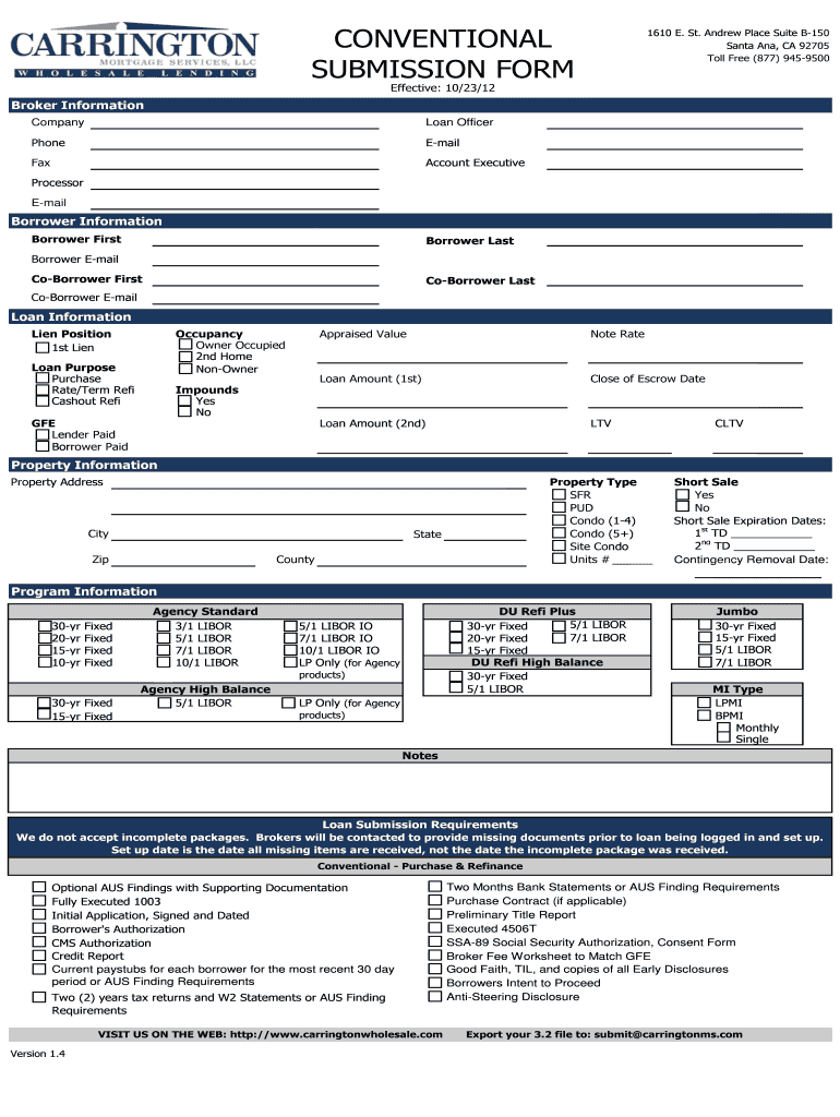 The Conventional Loan Submission Form is a financial document used by borrowers and brokers to apply for conventional purchase and refinance loans.